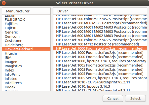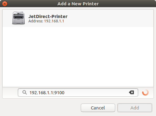 At this point, the printer daemon is up and running. The next step is to install the printer on the computer. Depending on the OS on your computer, follow the instructions here, and use your router IP address and the port 9100. For instance, if you have Ubuntu installed in your computer, go to printers and click the + button to add a printer and type 192.168.1.1:9100 in the network address input field, assuming that's your router IP. A JetDirect printer will appear, select it and then choose the HP foo2zjs driver previously installed, see the two images bellow